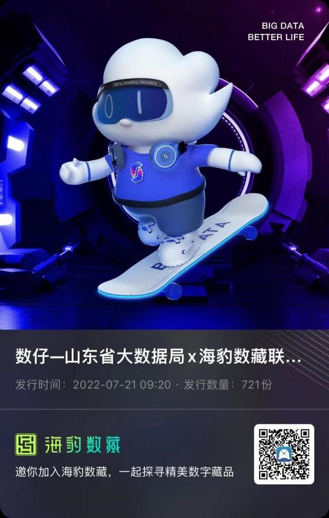 2022年数字强省启动月宣传仪式于7月21日启动,山东省大数据局与“海豹数藏”联合重磅推出的首款政务数字藏品——数仔也同步发布,目前已在海报新闻客户端“海豹数藏”频道开启藏品公益预购,本次藏品721份在海报新闻客户端免费公开领取,5000份在爱山东APP及小程序发行。