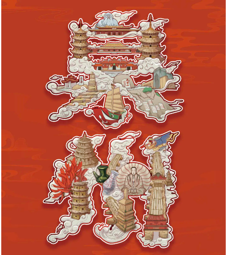 设计理念:泉”字按照古刺桐港的背山面海的走势进行布局,从最远处的清源山老君岩坐像,再到威严的大雄宝殿与东西双塔,烟火气中依稀可见府文庙大成殿和天后宫,“州”字从左开始由刺桐港的远近航标塔一一六胜塔和万寿塔构成第一部分,刺桐花点缀其间,中间两个宋元瓷器代表着来自泉州腹地以及当时刺桐港经济圈内的各种贸易品,最后用一尊充满灵性的“泉州飞天”一一妙音鸟做点缀,代表着在中古世界繁荣巨港的宏大背景下,泉州的多元融合韵曲悠长。